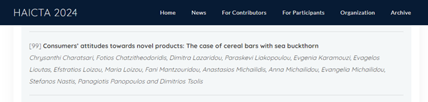 Το Αριστοτέλειο Πανεπιστήμιο Θεσσαλονίκης θα συμμετάσχει στο HAICTA 2024 παρουσιάζοντας την έρευνα που διεξήχθη στο πλαίσιο του έργου, εστιάζοντας στο θέμα: «Συμπεριφορές καταναλωτών προς νέα λειτουργικά προϊόντα διατροφής. Η περίπτωση των μπαρών δημητριακών εμπλουτισμένων με ιπποφαές».